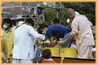 En esta imagen, vemos a miembros de la familia VRINDA, dando alimento a la zona azotada por el terremoto de Pereira (Colombia), durante esta catastrofe natural miembros de VRINDA ayudaron con distribución de alimento a poblados de esta localidad colombiana.